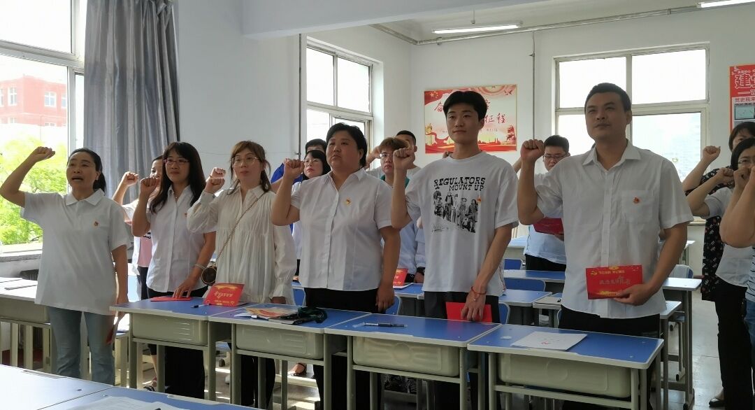 在《走向复兴》的乐曲声中,支部的党员教师为7名预备党员佩戴了光荣神圣的党徽;在大会最庄严的时刻,面向党旗,全体党员高举右拳,由优秀党员张秀老师领誓,进行新党员入党宣誓,老党员重温入党誓词仪式。