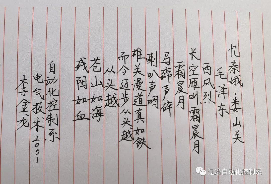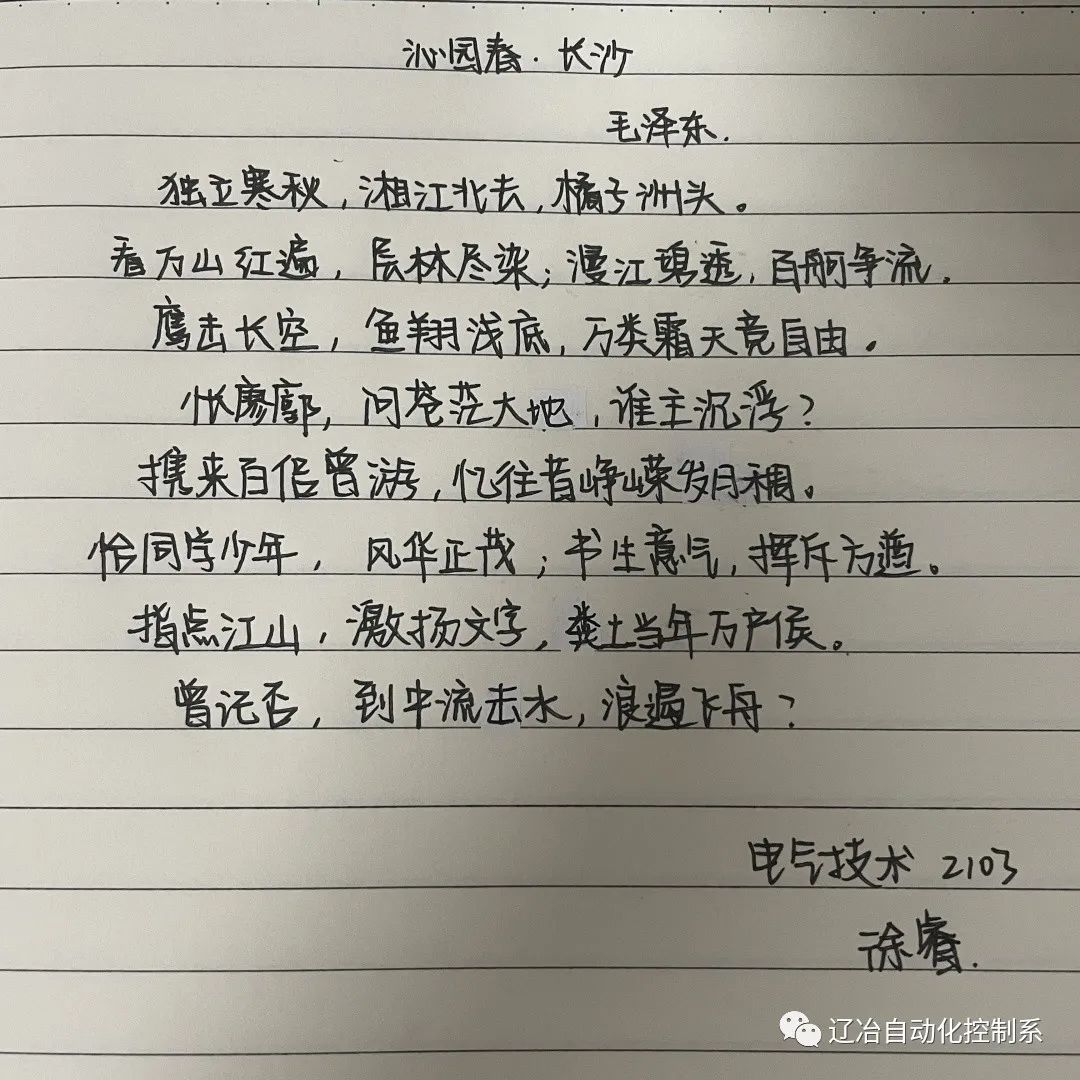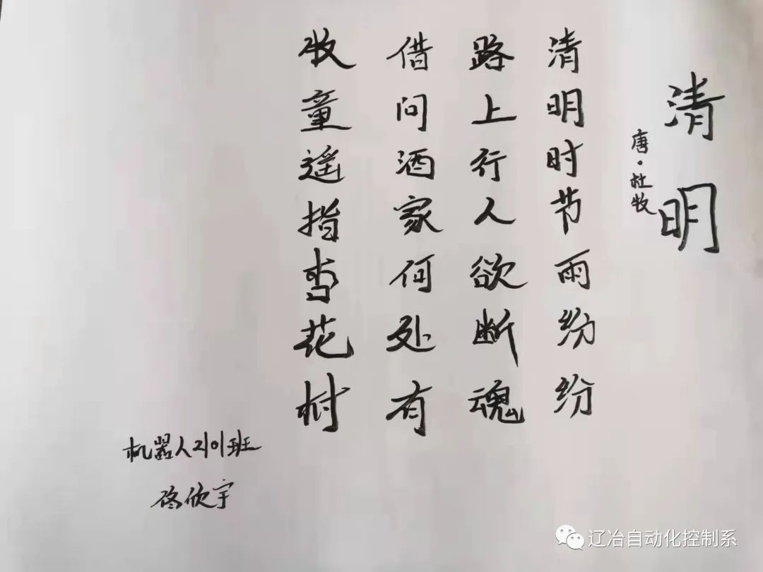 作为新时代大学生,要始终铭记历史、缅怀先烈,牢记今日的繁华盛世是革命先烈舍生忘死换来的,以笔墨传情、用心书写出凝聚革命精神的诗词,展示了自控系学生的艺术才华,把真挚的情思融入到书法作品中,表达出对祖国无限的热爱之情。