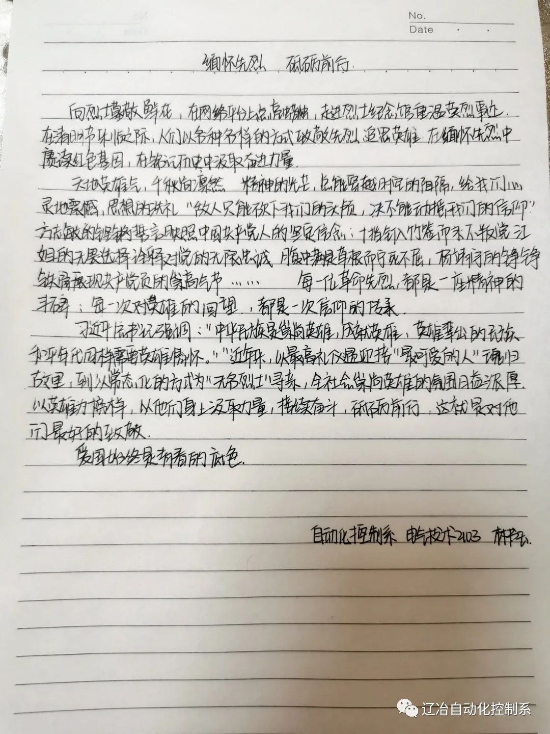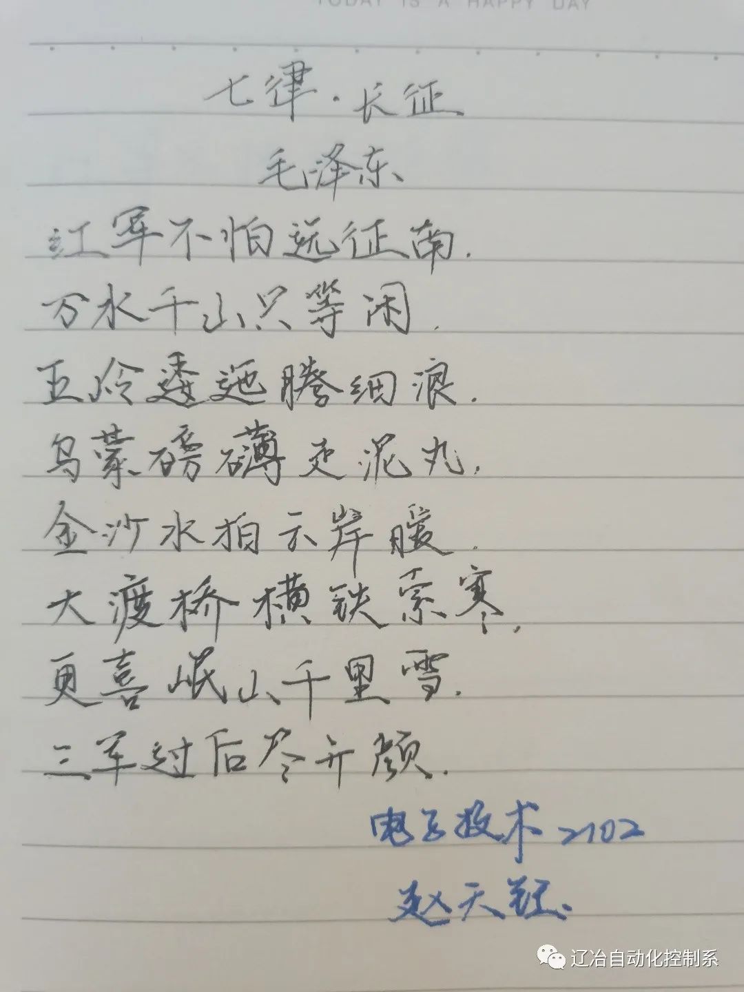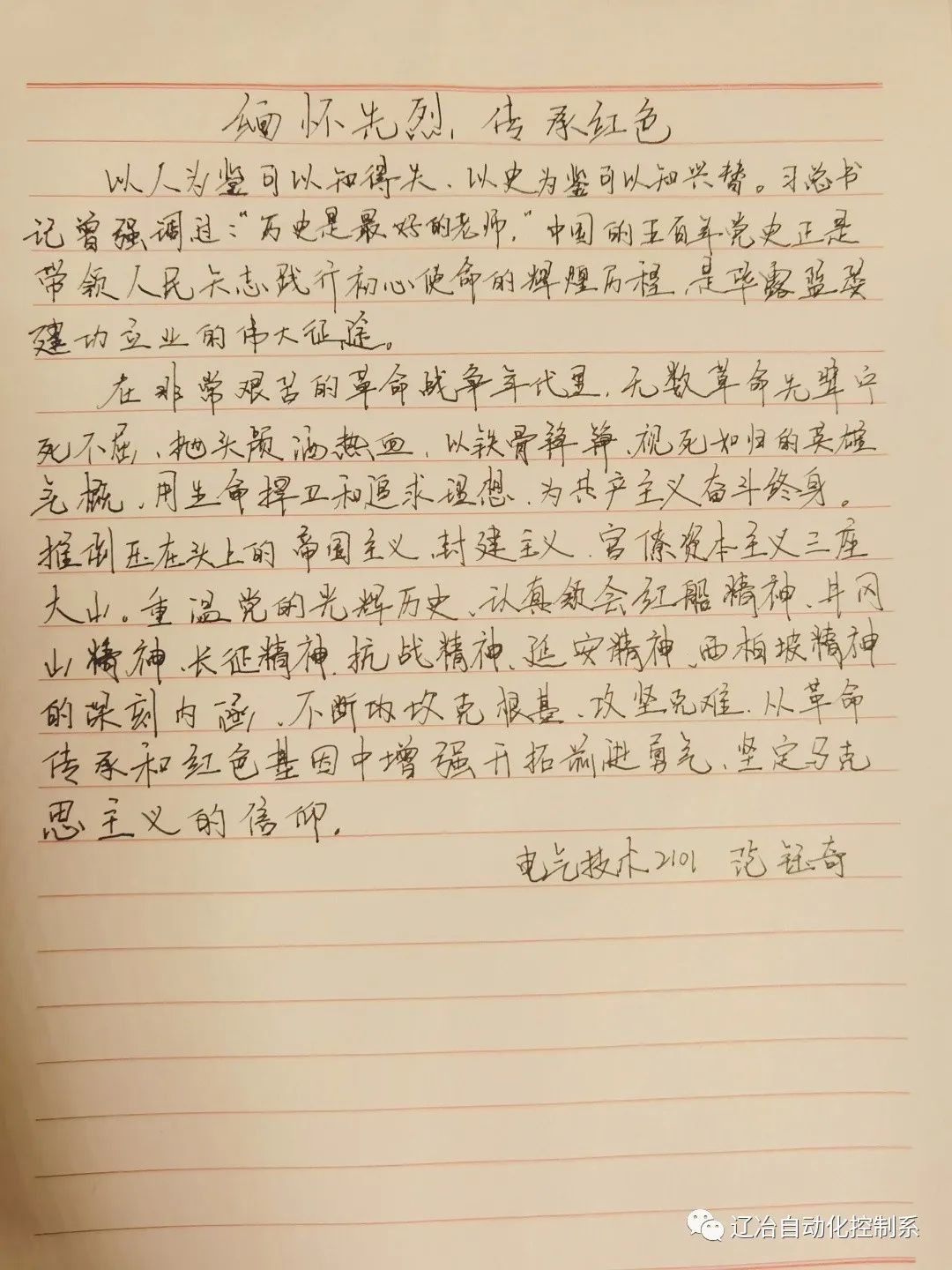 作为新时代大学生,要始终铭记历史、缅怀先烈,牢记今日的繁华盛世是革命先烈舍生忘死换来的,以笔墨传情、用心书写出凝聚革命精神的诗词,展示了自控系学生的艺术才华,把真挚的情思融入到书法作品中,表达出对祖国无限的热爱之情。